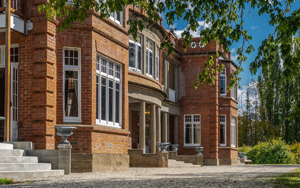 Earnscleugh Castle is a Category 1 Heritage New Zealand-listed Jacobethan manor, tucked just outside the historic gold-mining town of Clyde in Central Otago. With its dramatic red-brick façade, sweeping gardens, and views over the Fraser River and Old Man Range, it’s one of the most distinctive heritage homes in New Zealand.